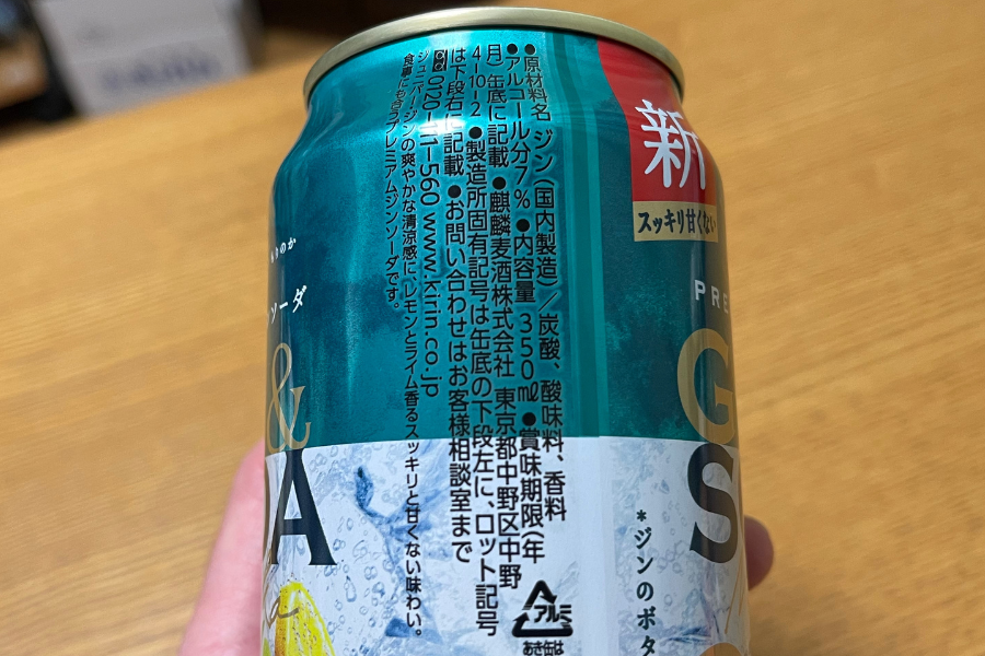 原材料はジン(杜の香)、炭酸、酸味料、香料とあります。よく見ると「レモンとライム香るスッキリと甘くない味わい」との表記が。無果汁ながら香料で柑橘がいるのだと予想できますね。