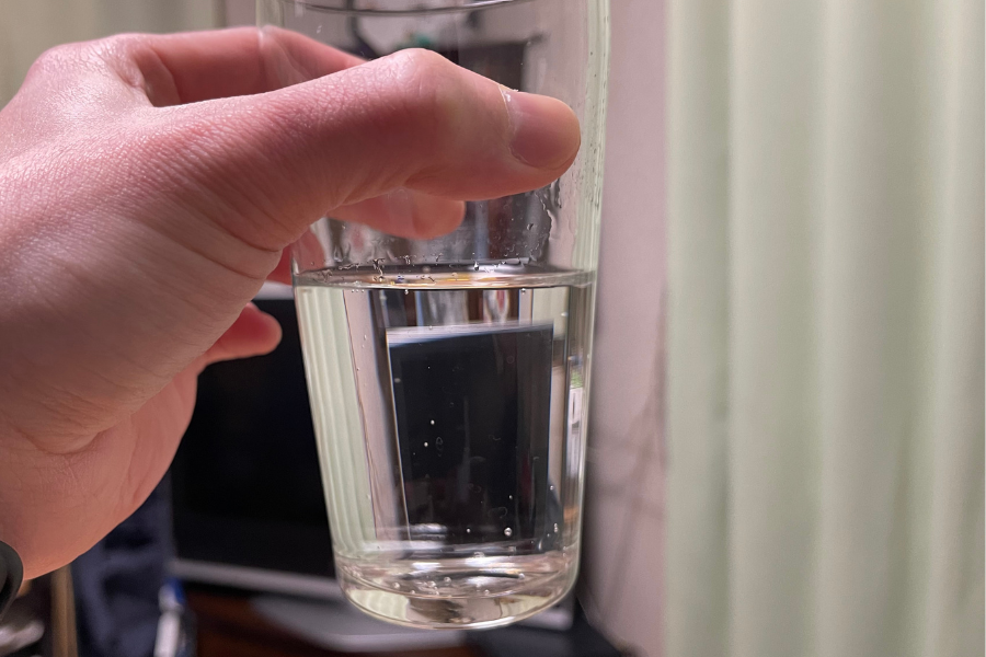 ダイソーのかろやか上質グラスタンブラーに注ぎます。